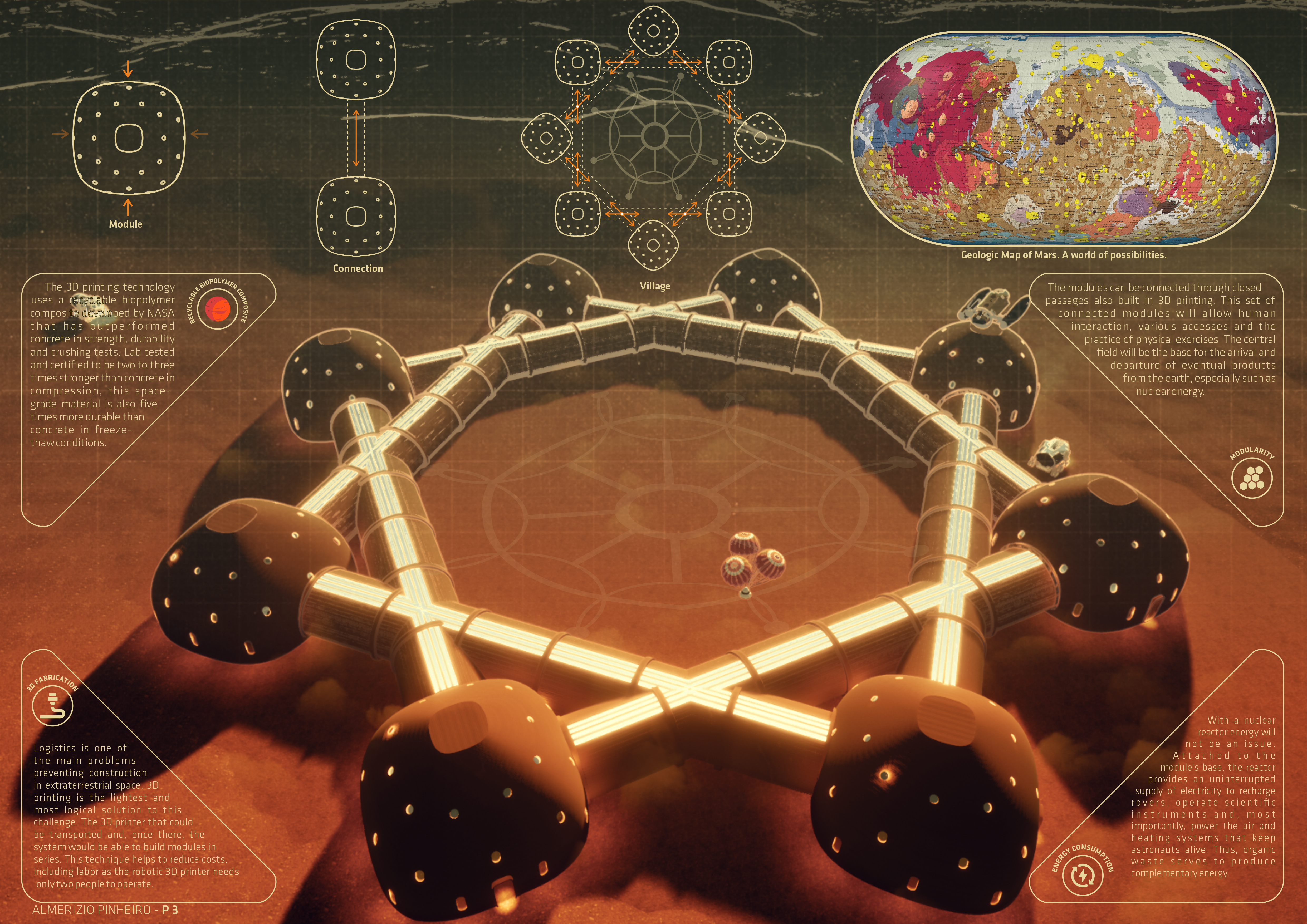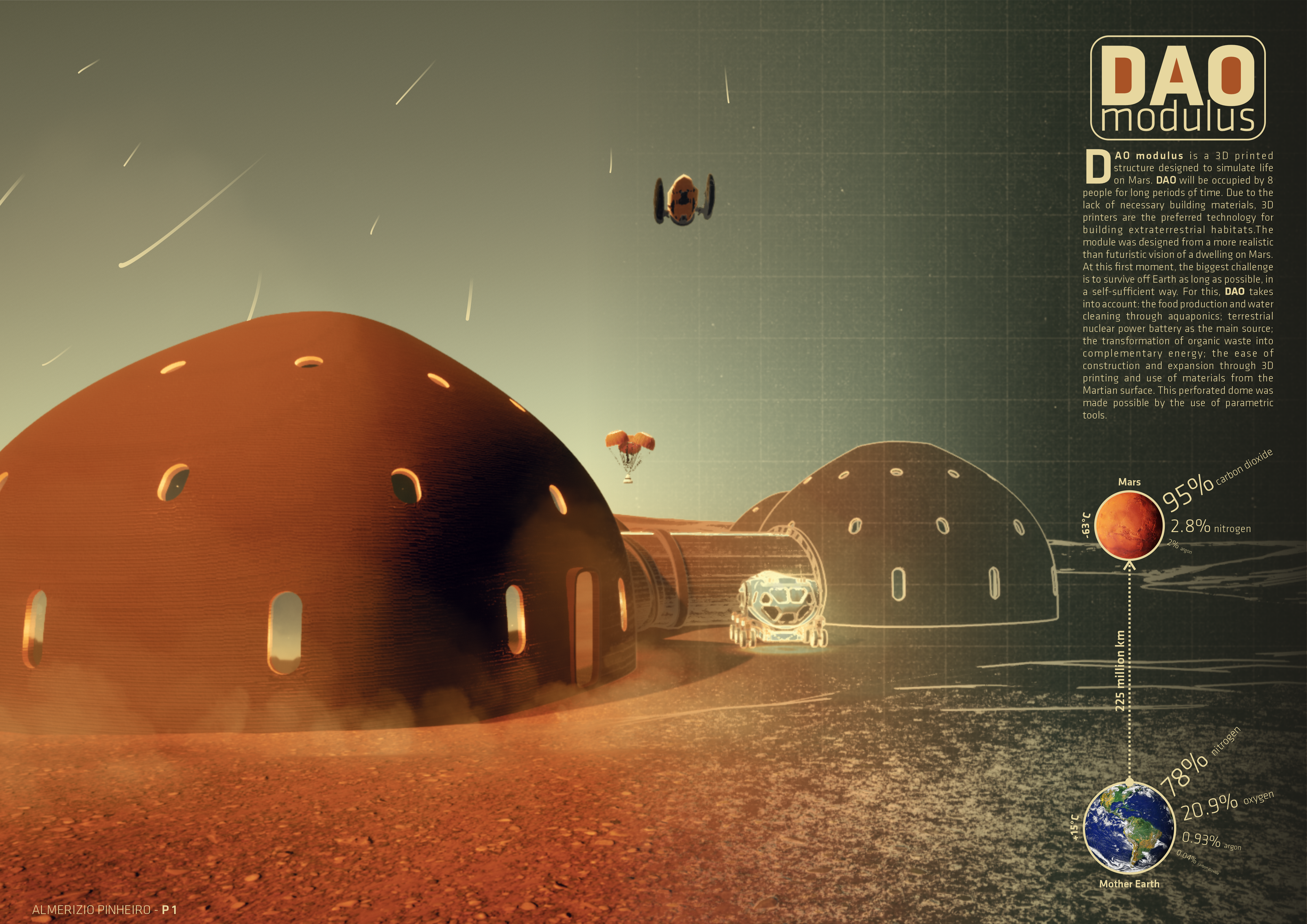 DAO modulus is a 3D printed structure designed to simulate life on Mars. DAO will be occupied by 8 people for long periods of time. Due to the lack of necessary building materials, 3D printers are the preferred technology for building extraterrestrial habitats.The module was designed from a more realistic than futuristic vision of a dwelling on Mars.