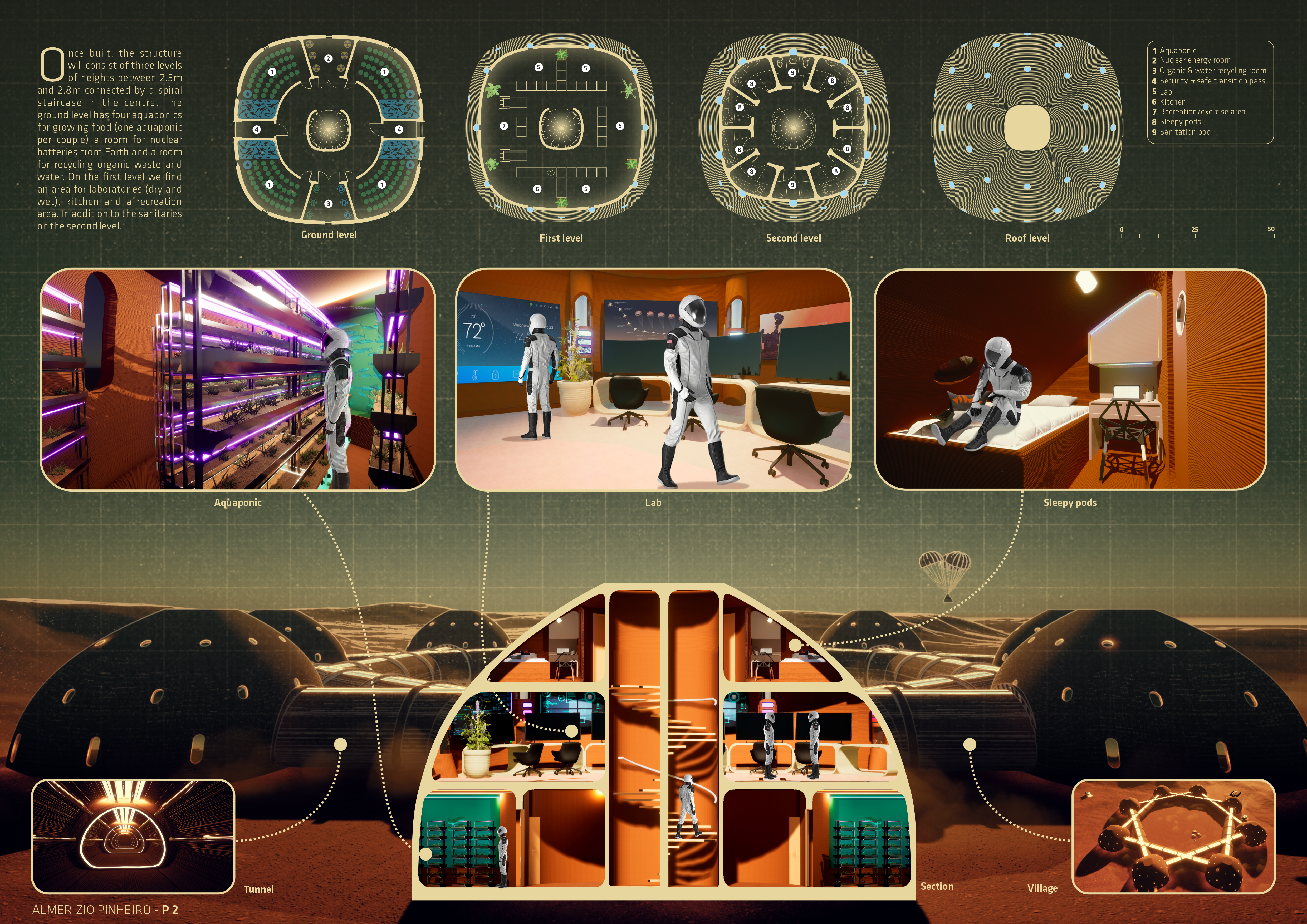 At this first moment, the biggest challenge is to survive off Earth as long as possible, in a self-sufficient way. For this, DAO takes into account: the food production and water cleaning through aquaponics; terrestrial nuclear power battery as the main source; the transformation of organic waste into complementary energy; the ease of construction and expansion through 3D printing and use of materials from the Martian surface. This perforated dome was made possible by the use of parametric tools.