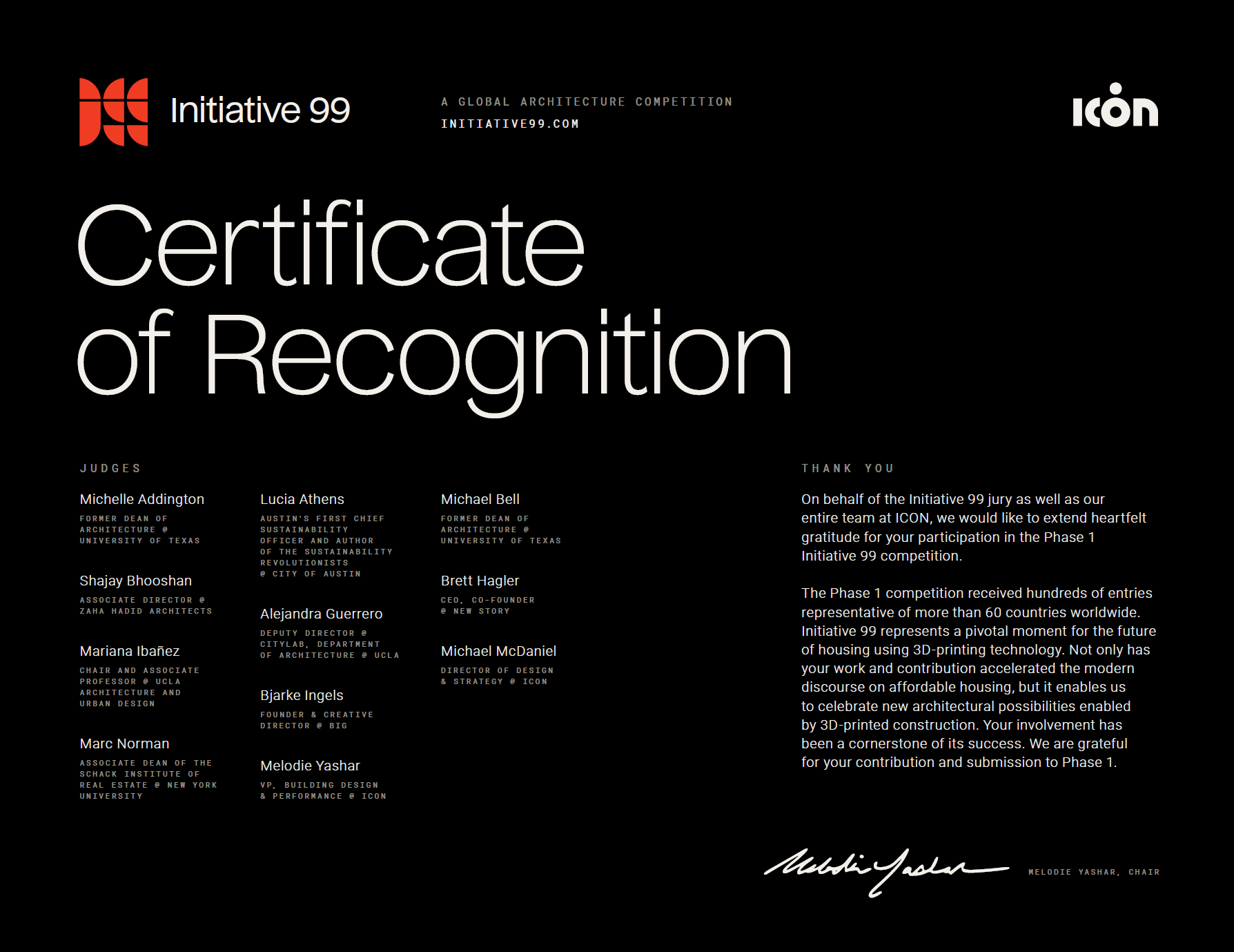 Certificate of Recognition // Initiative 99 + ICON 3D