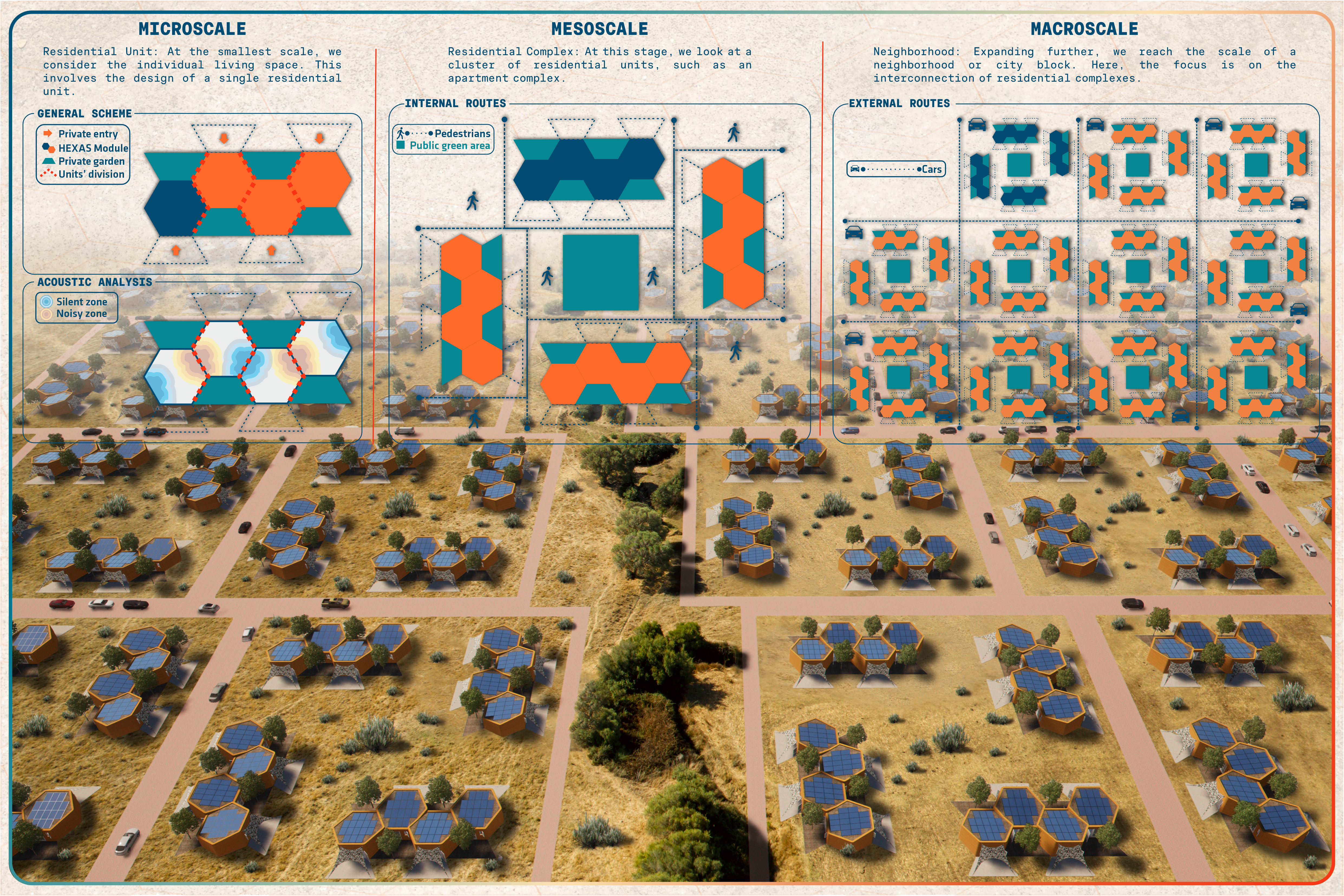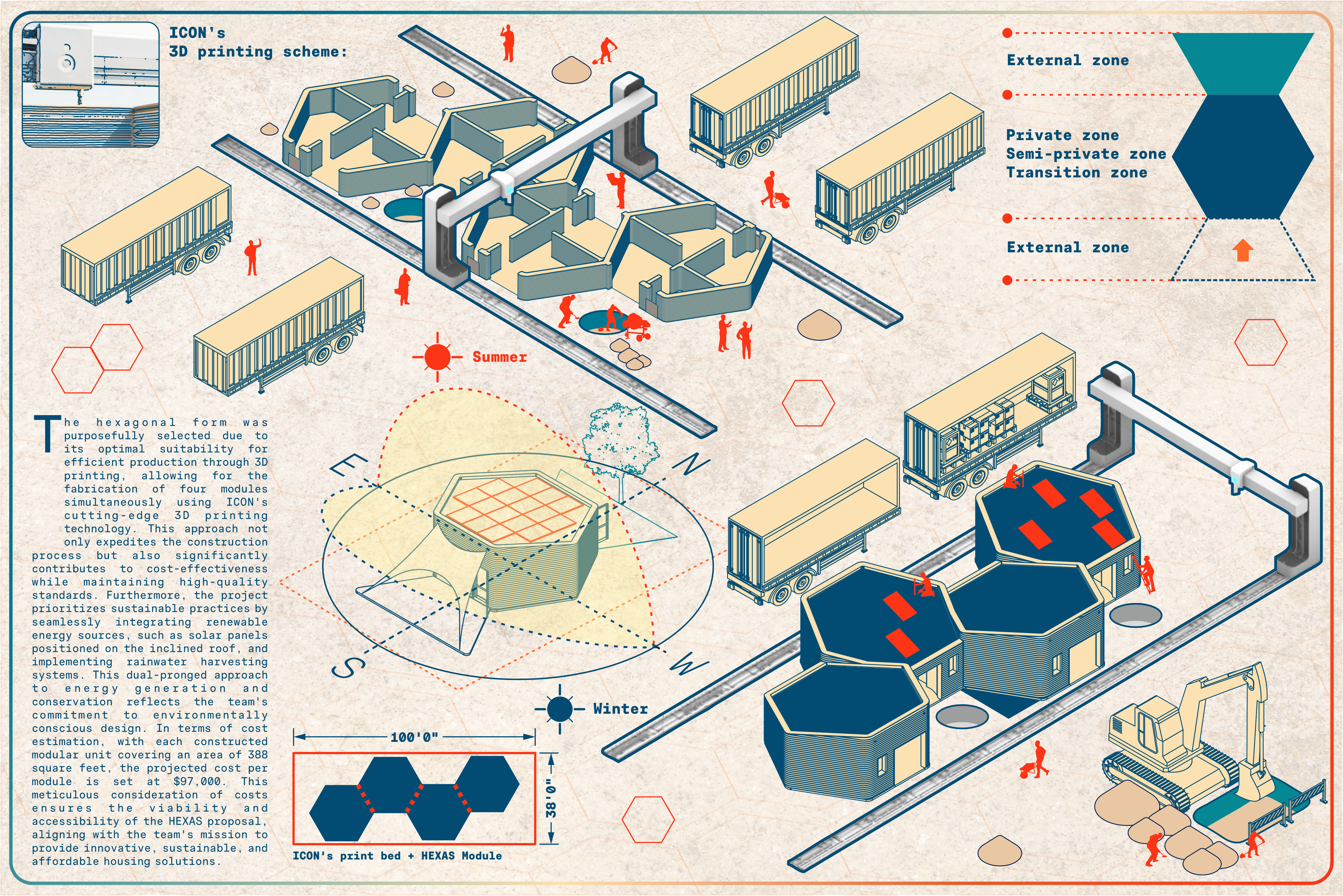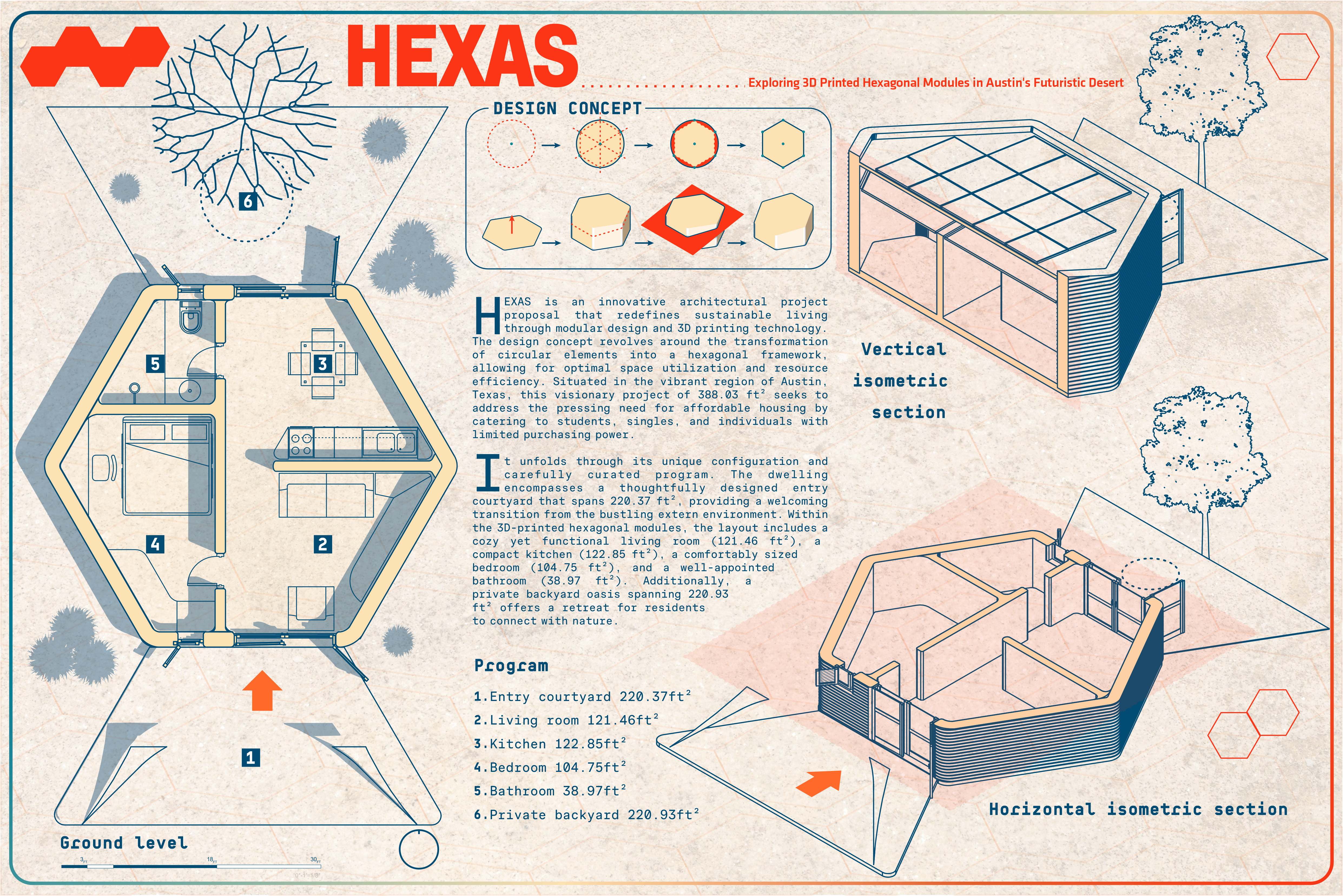 HEXAS is an innovative architectural project proposal that redefines sustainable living through modular design and 3D printing technology. The design concept revolves around the transformation of circular elements into a hexagonal framework, allowing for optimal space utilization and resource efficiency. Situated in the vibrant region of Austin, Texas, this visionary project of 388.03 ft² seeks to address the pressing need for affordable housing by catering to students, singles, and individuals with limited purchasing power. Proposal for Iniciative 99 sponsored by ICON Technology, Inc.