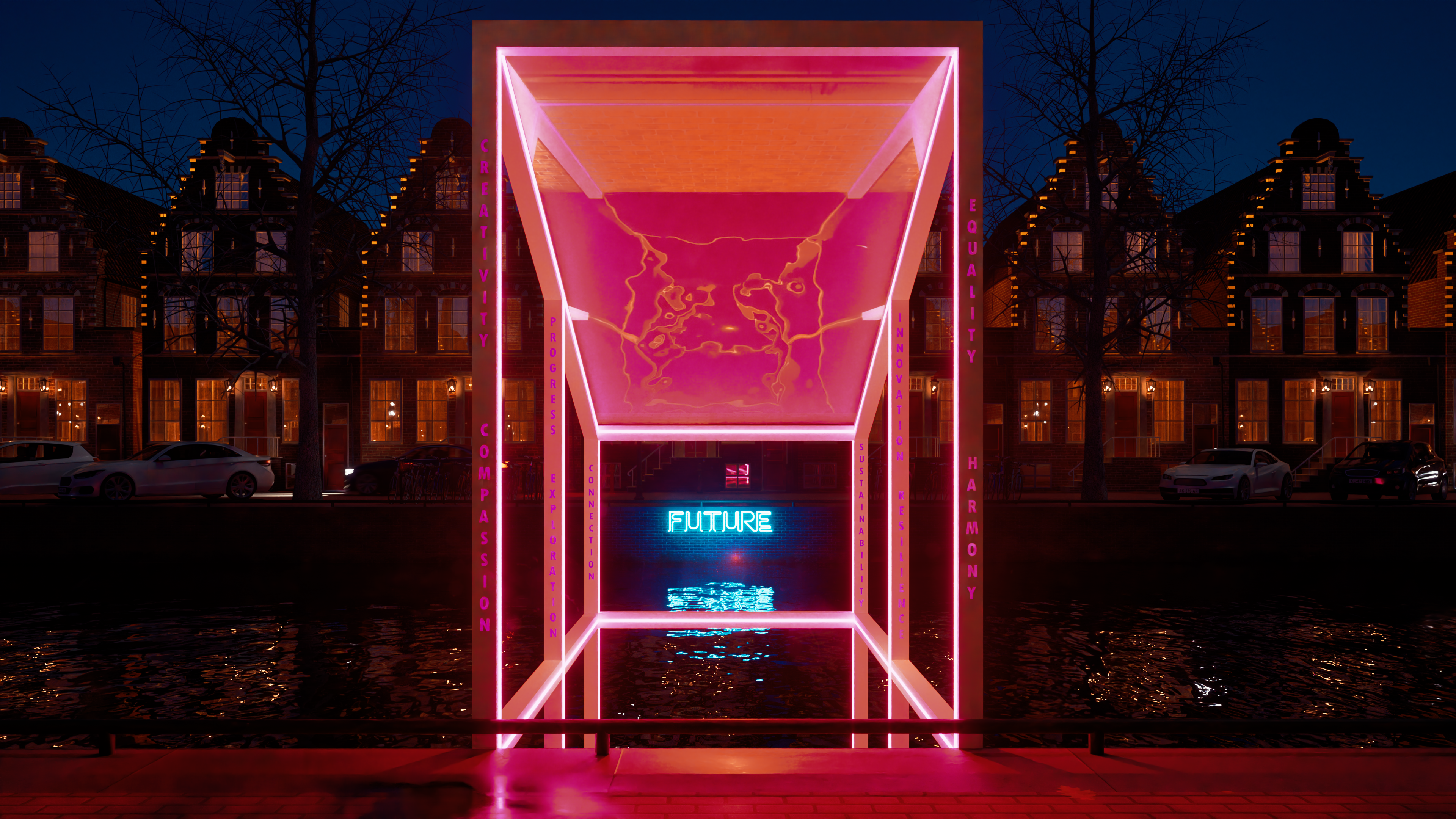 of society, while the red neon structure and the play of