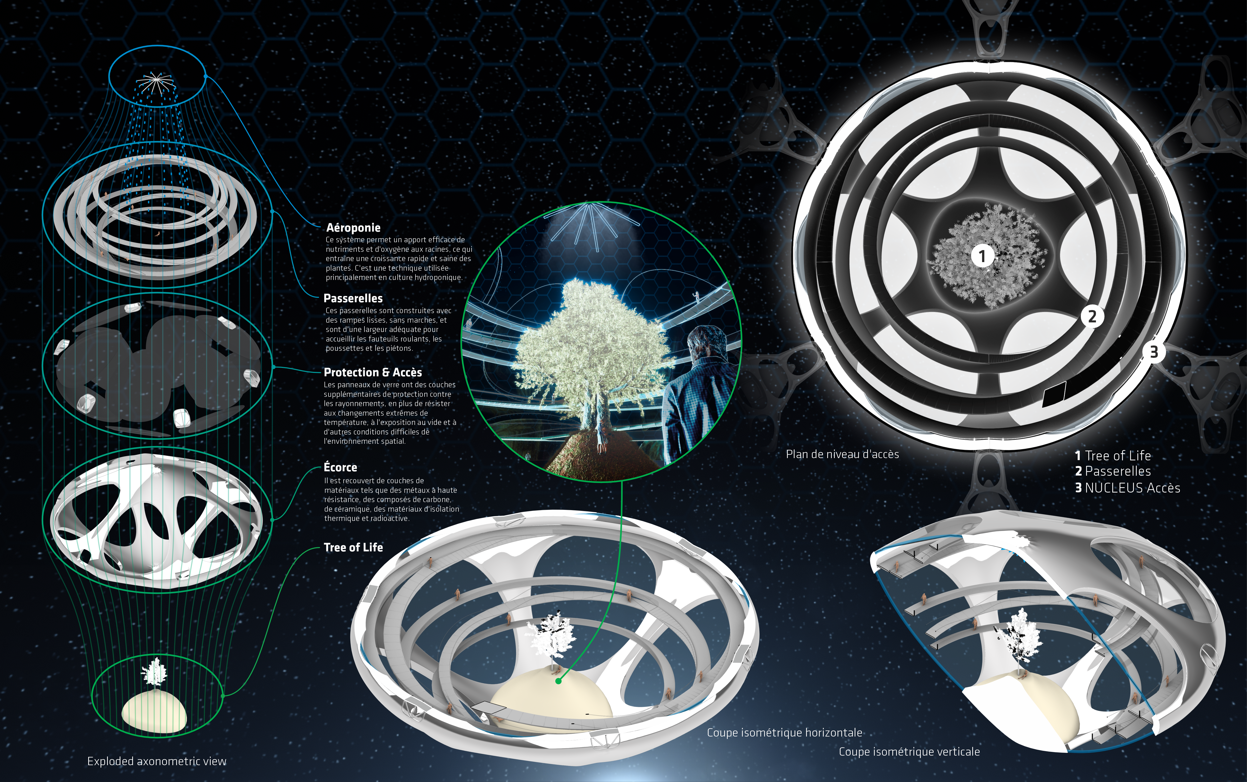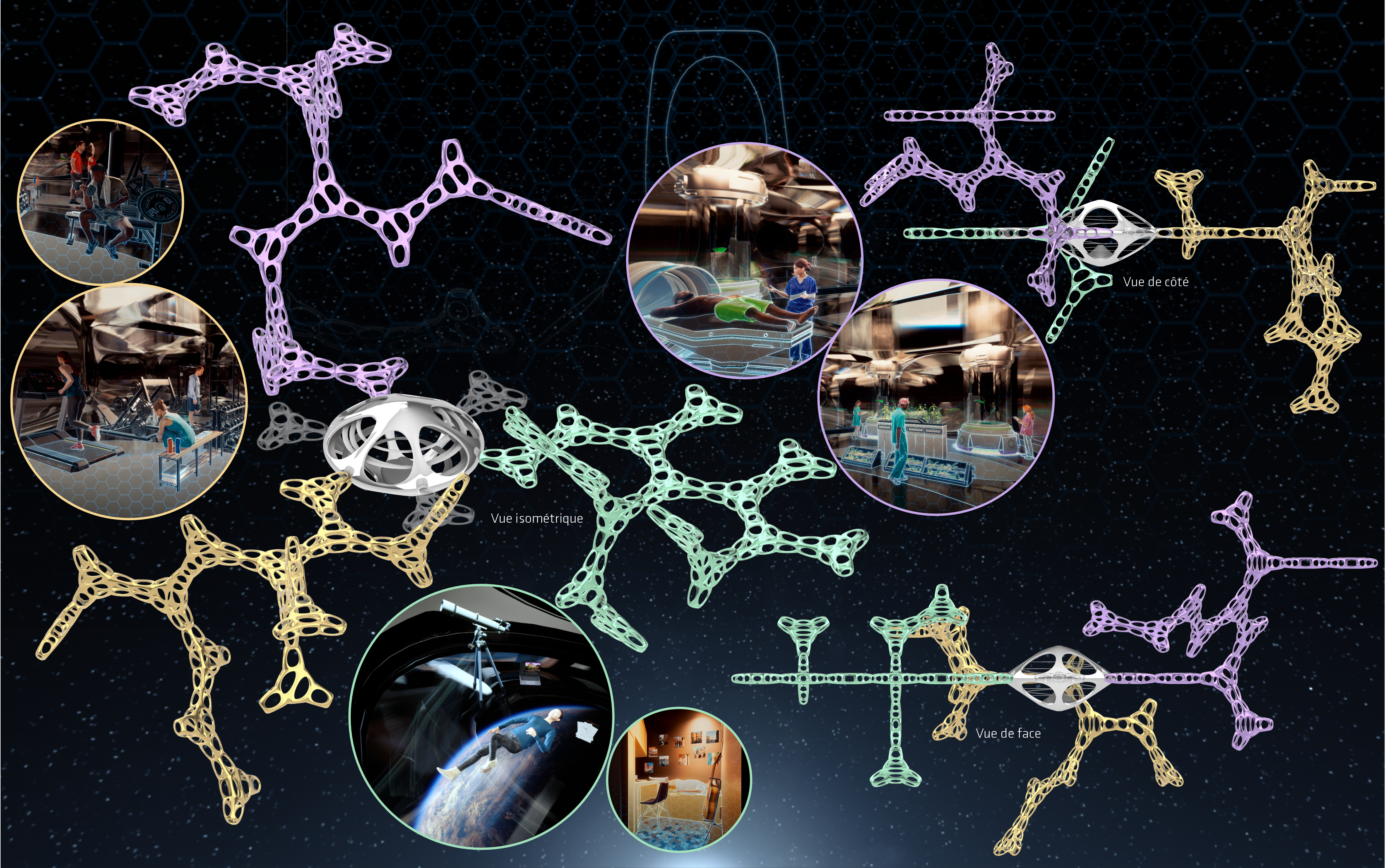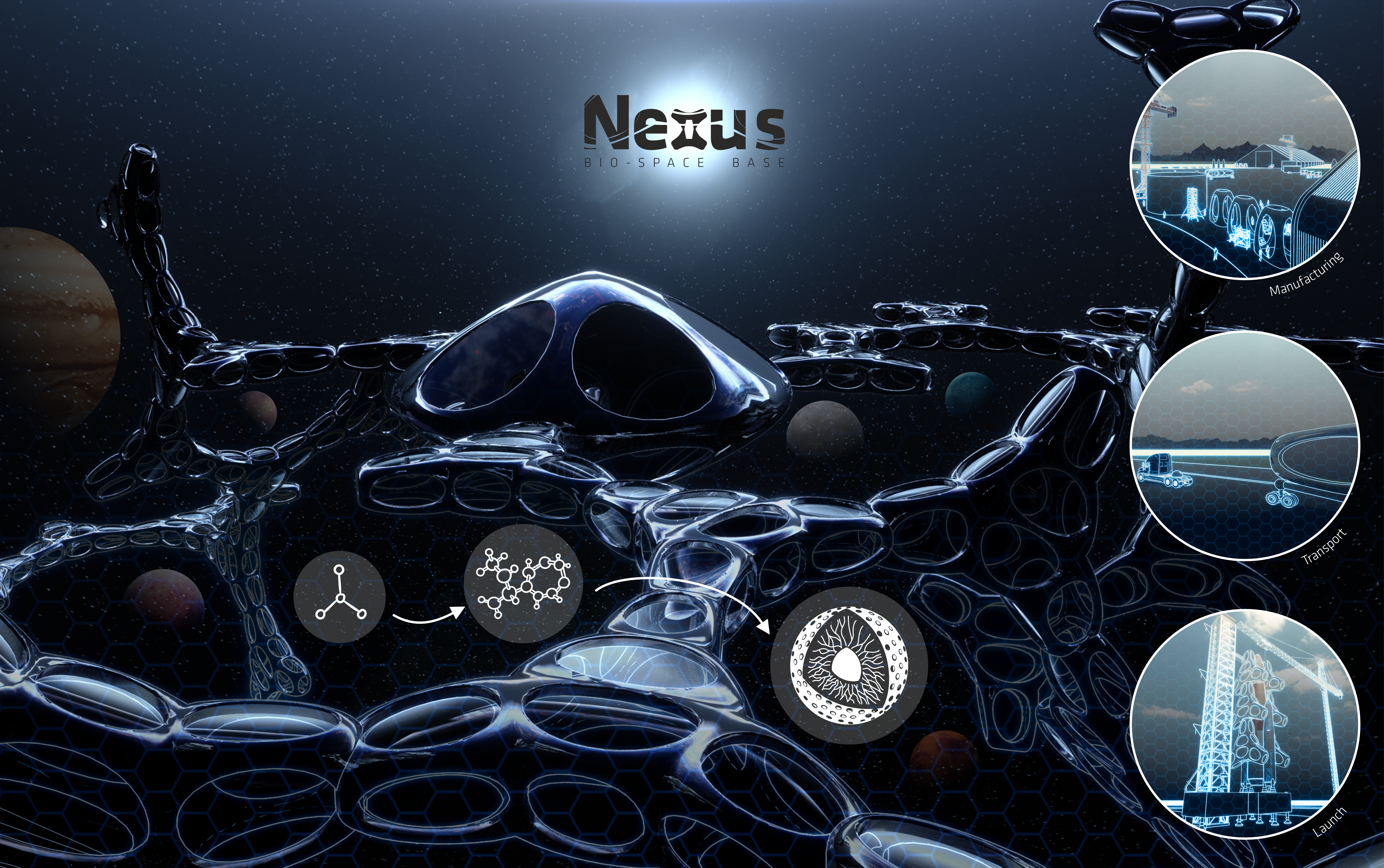 Nexus – Bio-Spatial Base is an innovative orbital space station around Earth, inspired by molecular and cellular geometry. It supports space activities, provides accommodation, research, and well-being in space, serving as a hub for future missions, tourism, and advanced research, driving space exploration and new technology development. Finalist project in the Fondation Jacques Rougerie 2023 competition.