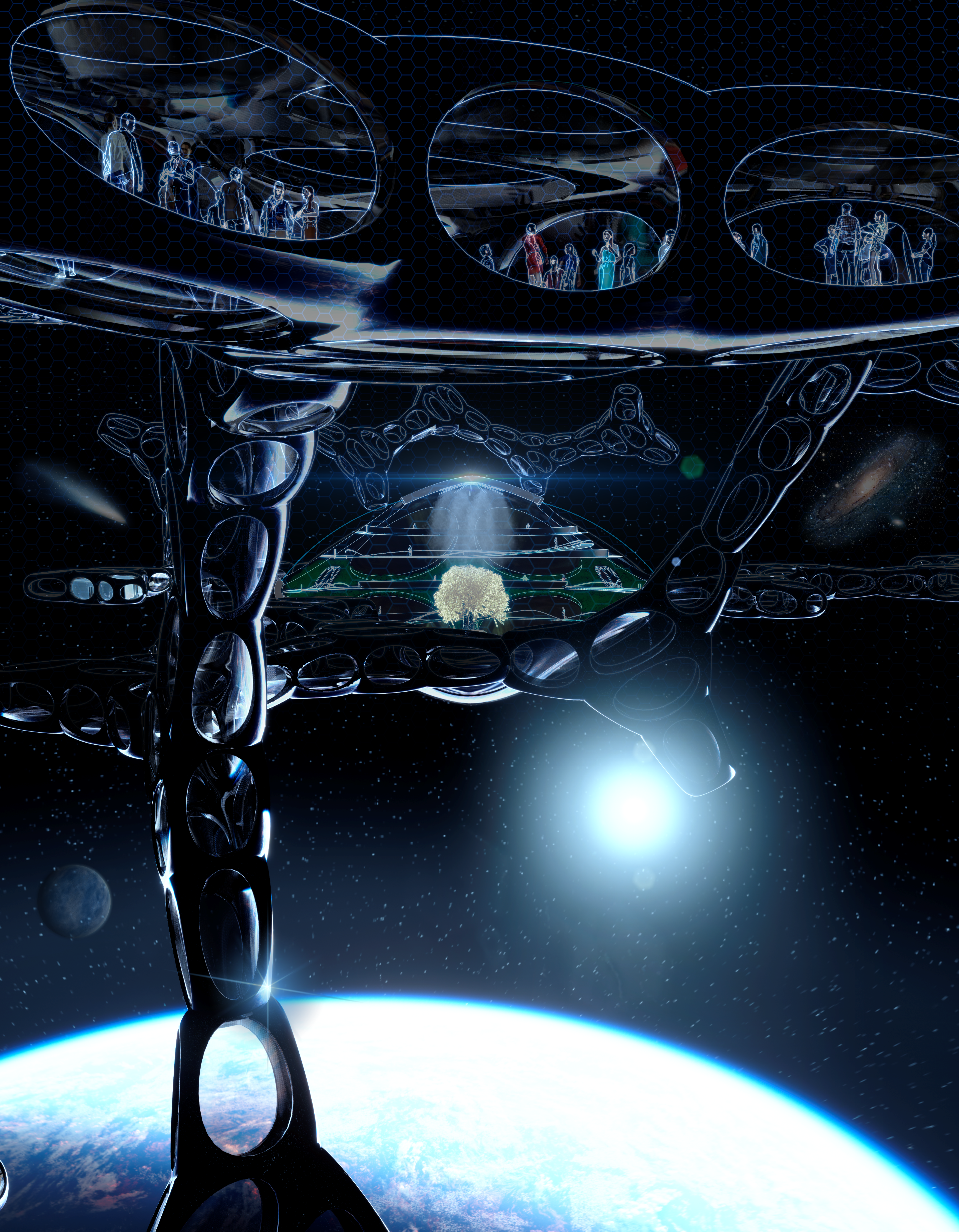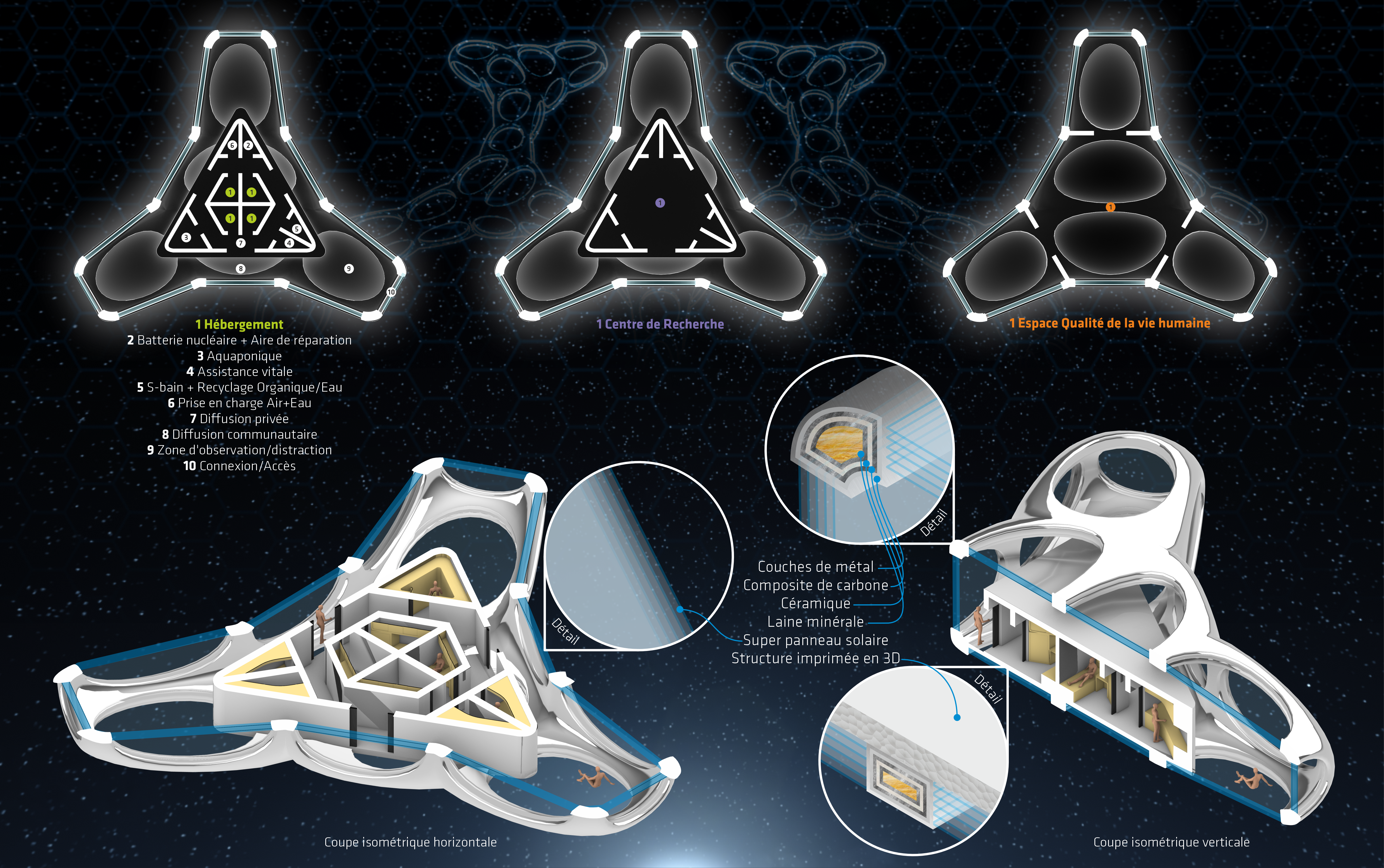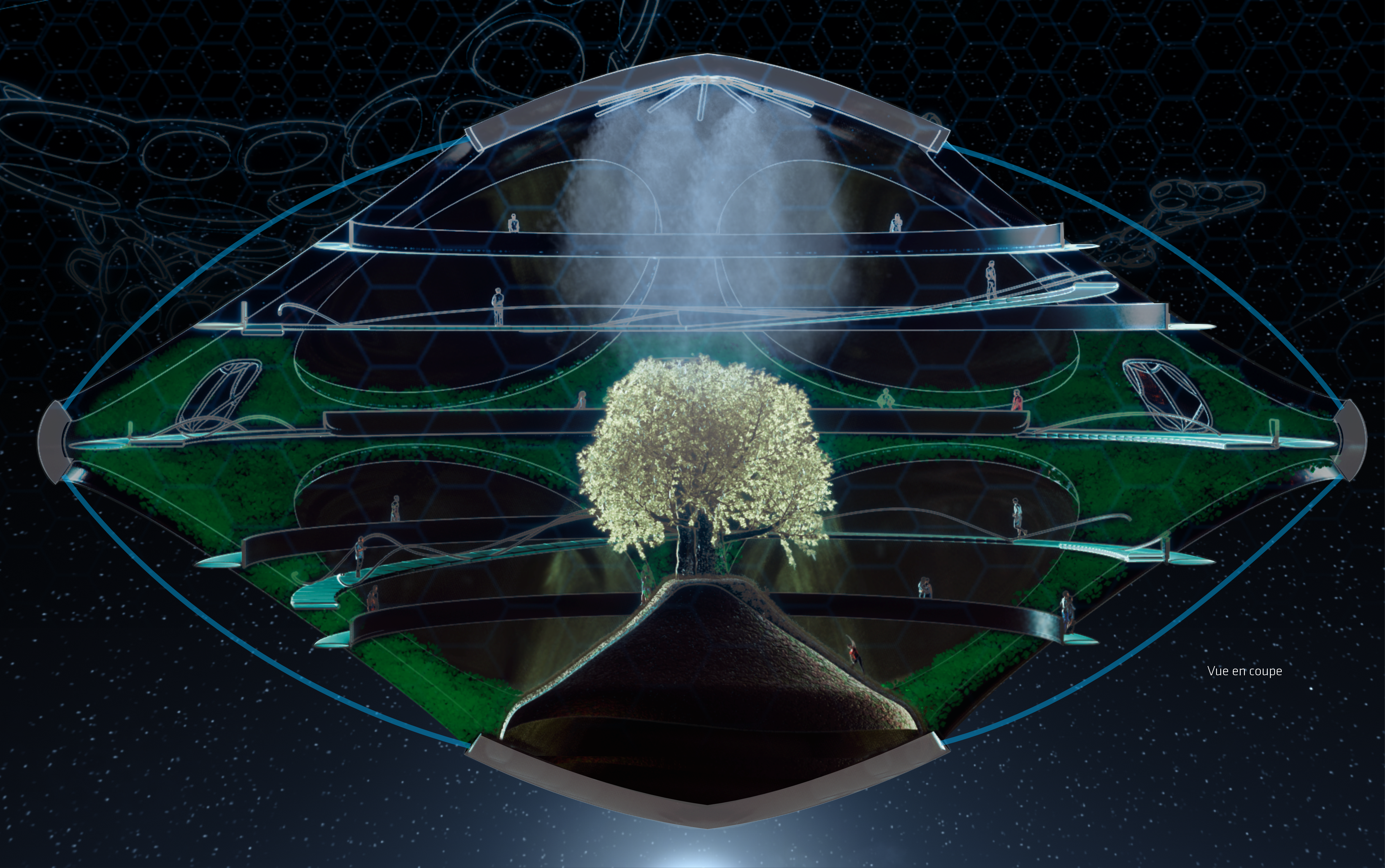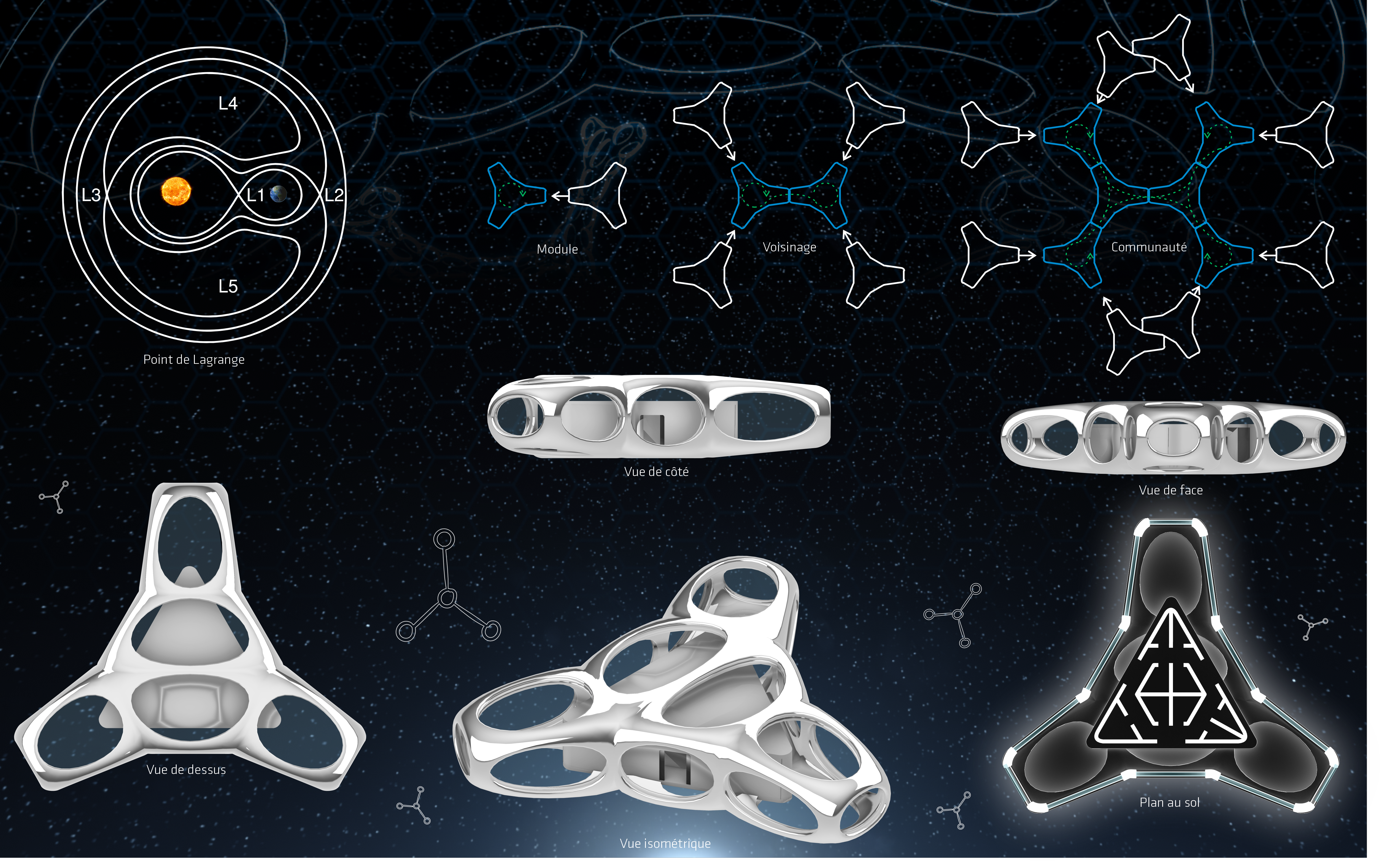 Nexus – Bio-Spatial Base is an innovative orbital space station around Earth, inspired by molecular and cellular geometry. It supports space activities, provides accommodation, research, and well-being in space, serving as a hub for future missions, tourism, and advanced research, driving space exploration and new technology development. Finalist project in the Fondation Jacques Rougerie 2023 competition.
