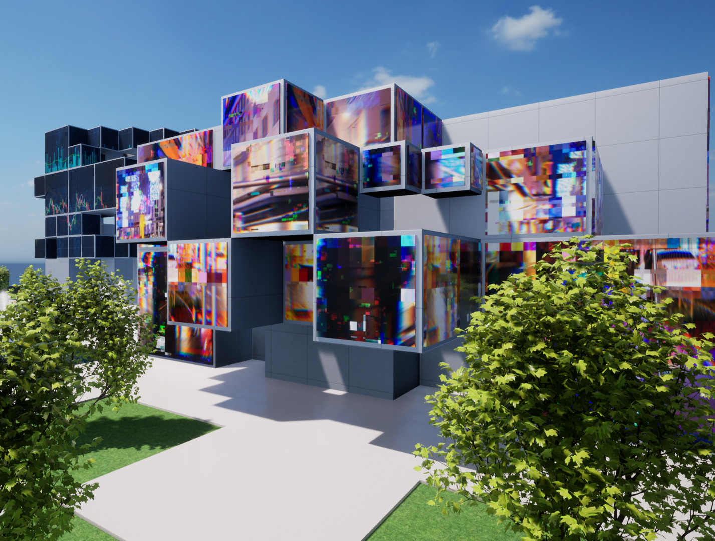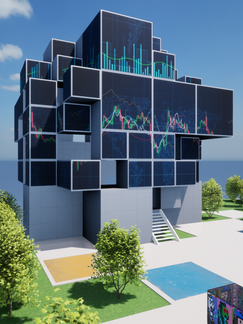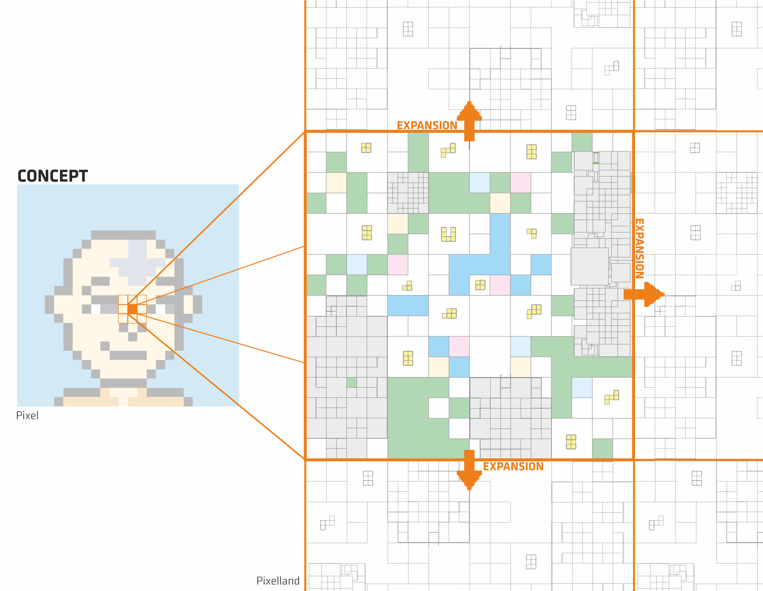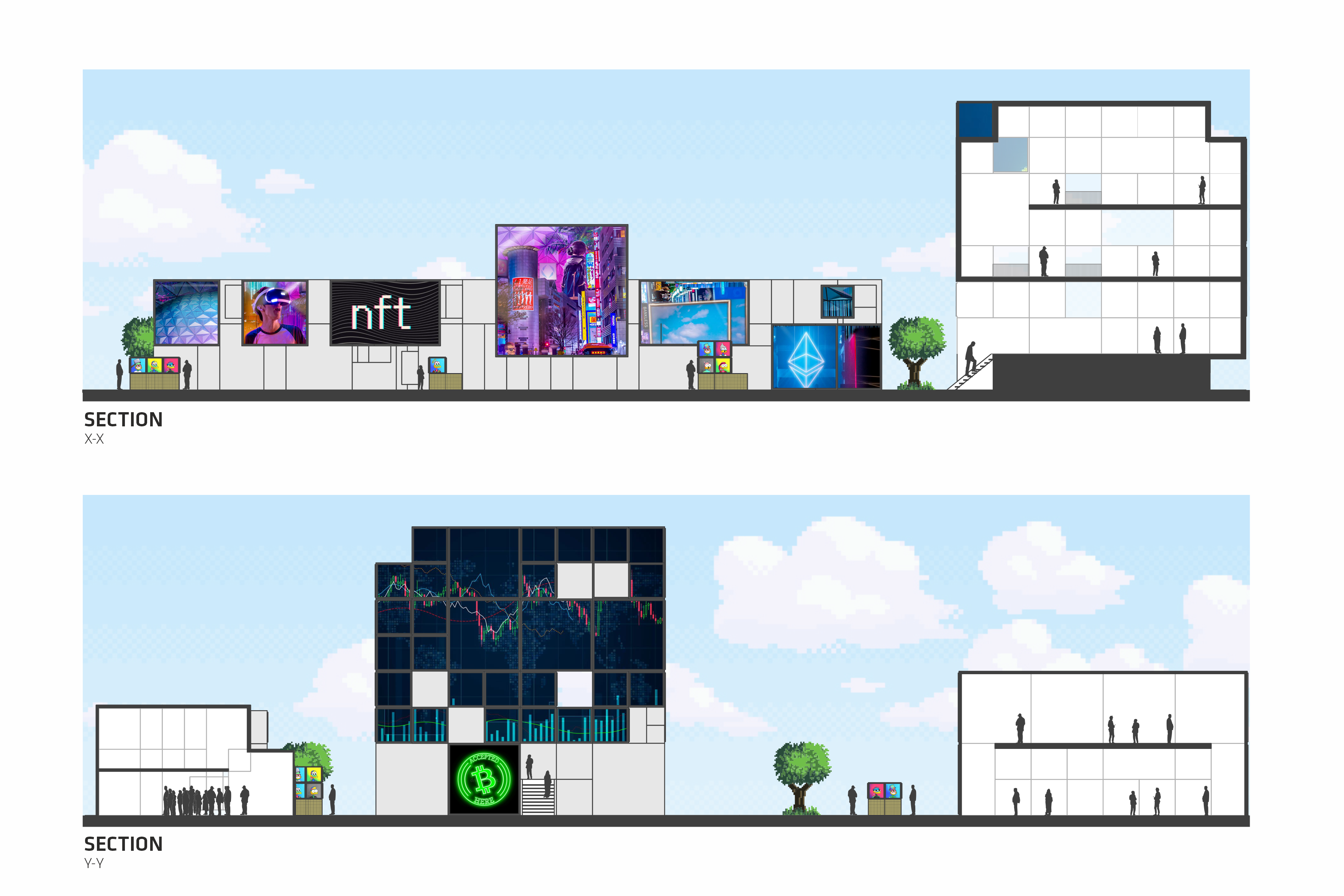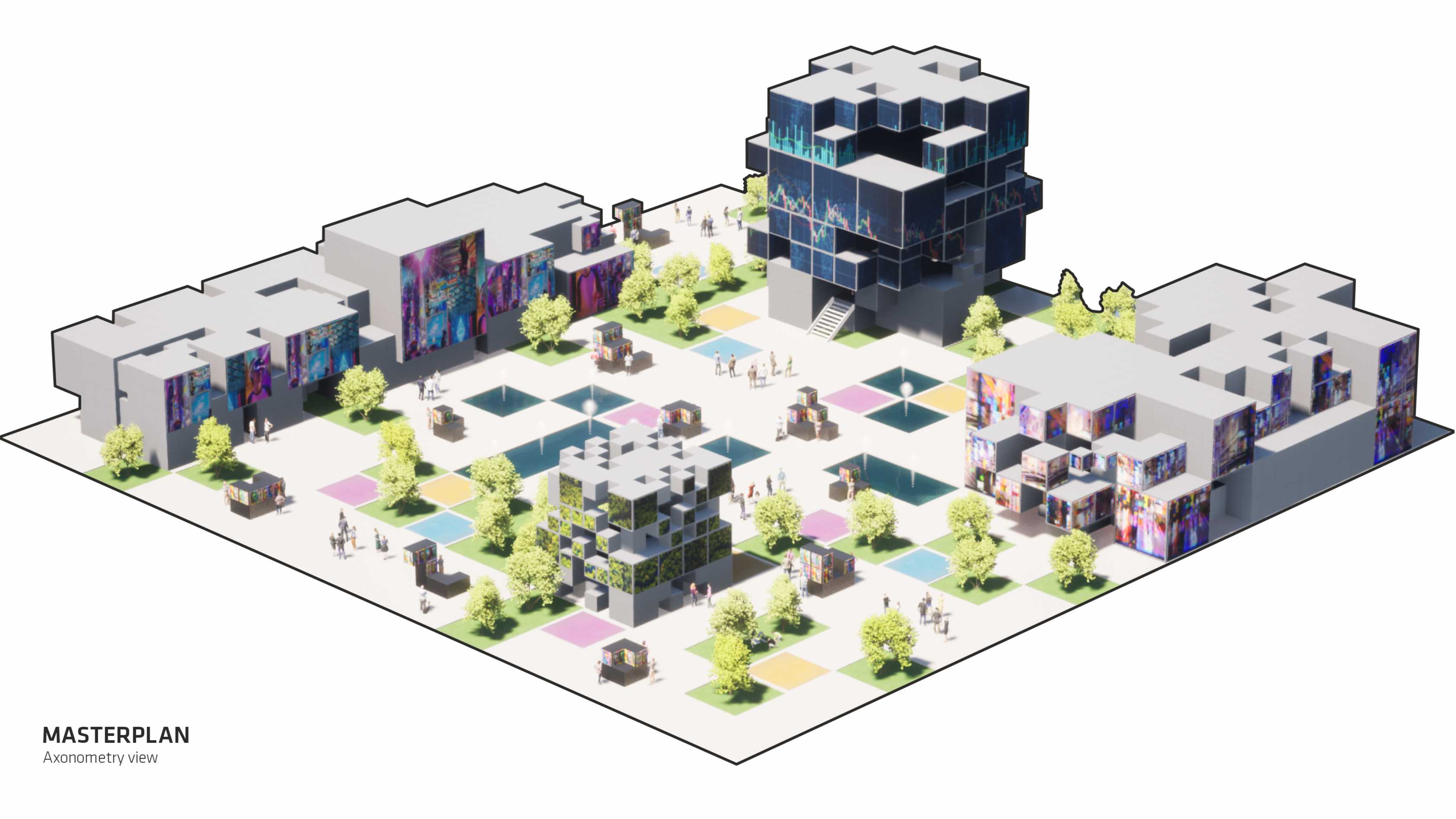 Pixel is the smallest point that forms a digital image, and a set of pixels with various colors form the entire image. Based on this concept, Pixelland is a digital art complex formed by several pixels through parametric architecture. In an area of approximately 54,000 ft² of virtual floor space we can find a Crypto market, Defi indoor expo, NFT indoor expo, Dapps Pavilion and City plaza which NFT & DeFi are displayed by small modules scattered around the land.